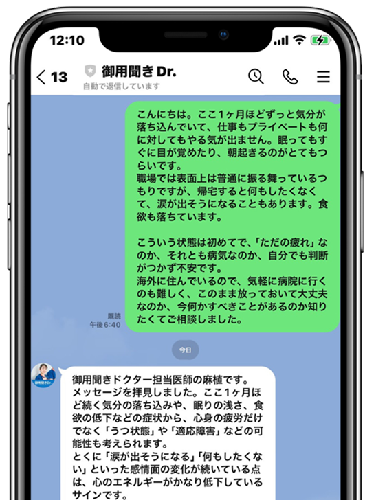 忙しい仕事の合間に気になる体調変化を相談。時間を気にせず自分のペースでやり取りできて、とても便利でした。