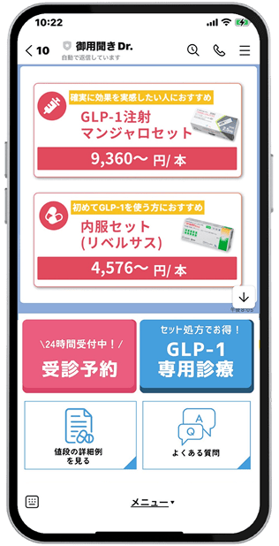 AGA専用診療ボタンを押すと、ご希望の種類・容量・本数を選べます。その後、チャット上で処方薬費をすぐに確認することができます。