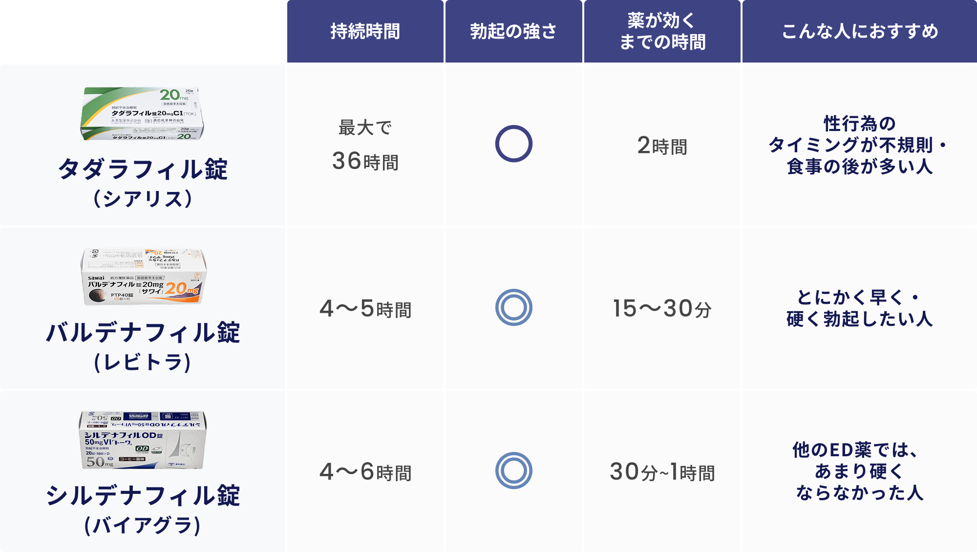ED治療薬には「性行為の前に服用するタイプ」と「毎日服用する低用量タイプ」があります。